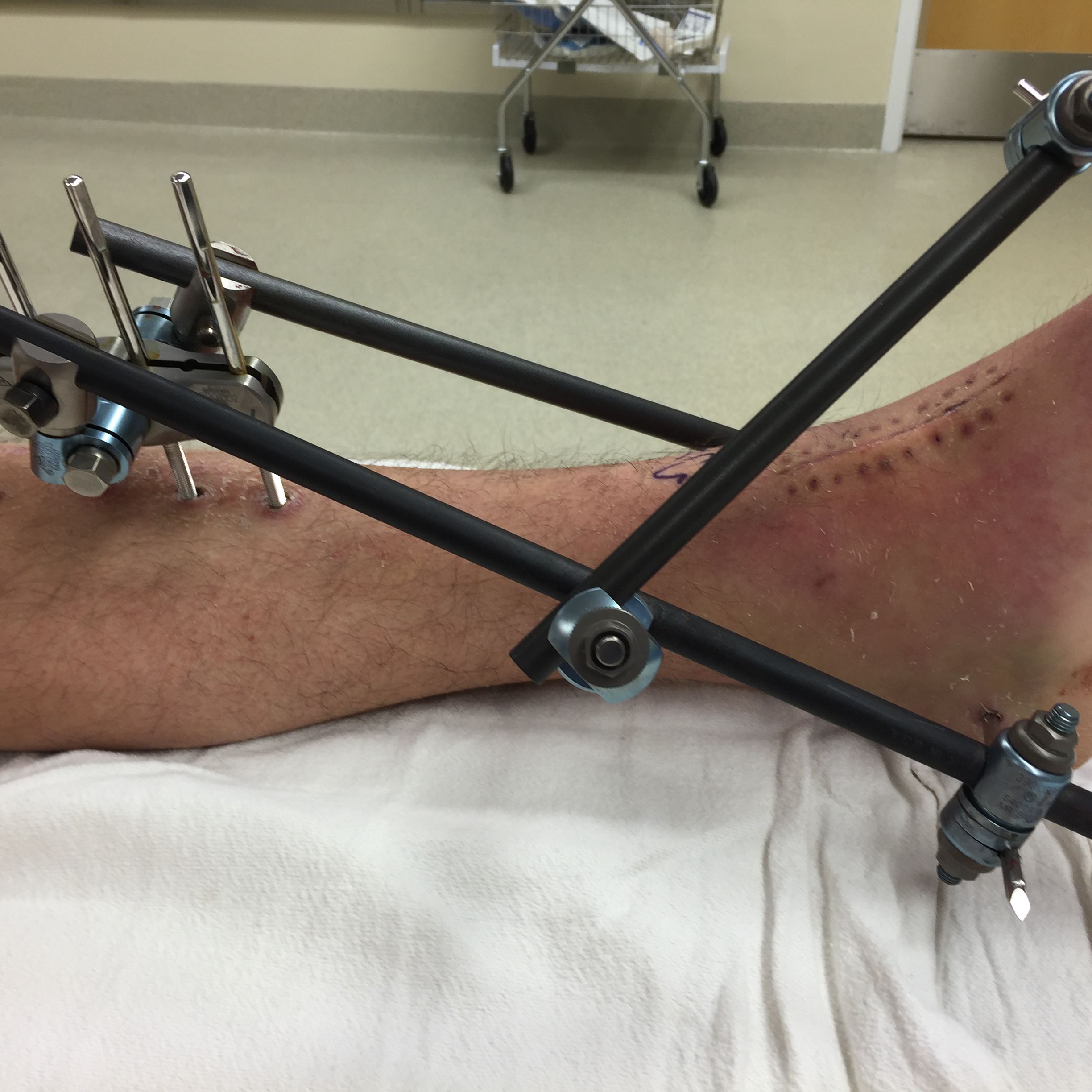 External fixators are made of stainless steel hollow rods of various sizes, long and short screw pins and clamps which are used to fix rods with the pins. These devices help to stabilize the fractured bones while remaining external to the body. These are mostly used for fracture where there is loss of tissue to adequately cover the fracture ends, in infected fractures etc.