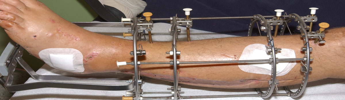 It is a type of external fixator and consists of large stainless steel half rings of various sizes, screw pins, arches, nuts and bolts, post and plates, trans fixation wires, rods, telescoping tubes etc. Most of the parts are outside of the bone of the patient except for the screw pins, and transfixing wires which connect the bone with the rings. The frame so constructed provides stability to the fracture in proper position and is strong enough to allow early weight bearing. It can also be used to lengthen short bones. An initial surgery is conducted and the short bone is artificially fractured at desired position and ring fixator is applied. The limb can gradually be lengthened by tightening and loosening the nuts so that the distance between two rings is gradually increased. This gradual distraction promotes bone formation and lengthening. Once the desired limb length is achieved distraction is stopped and the new bone is allowed to solidify after which the frame is removed. Deformities of limbs can also be corrected by variations of distraction and compression of rings one both sides of the bone.